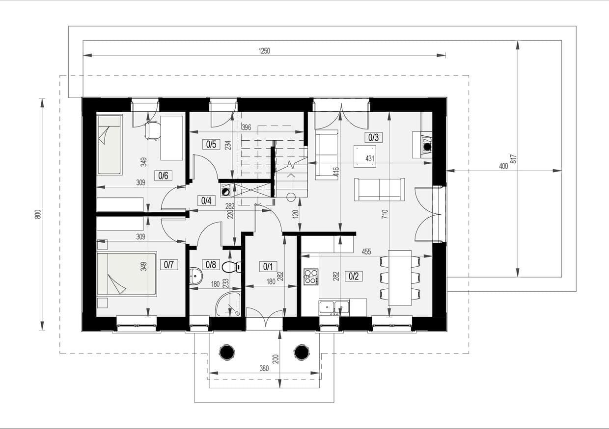 Dom KP-130 jest parterowym budynkiem z poddaszem użytkowym, dachem kopertowym przeznaczonym do zabudowy wolnostojącej. Budynek o powierzchni użytkowej 117,08 m2.